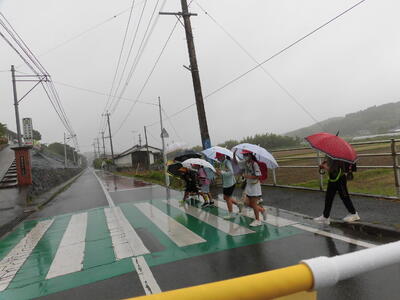 そんな中、民生・児童委員さんや見守り隊の方が濡れながら付き添ってくださいます。