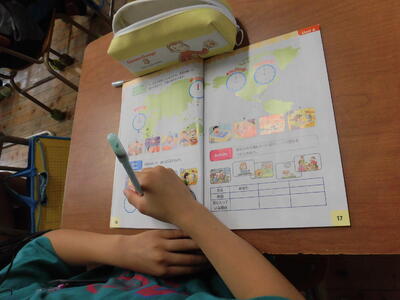 絵やネイティブの英語を頼りに、子供たちは時刻の言い方を学んでいきます。