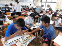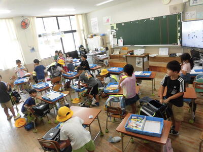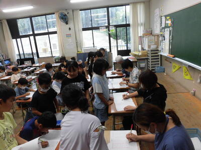 子供たちは、夏休み中に少し忘れてしまっていた基礎基本の計算や時計の読み方などを、練習しました。