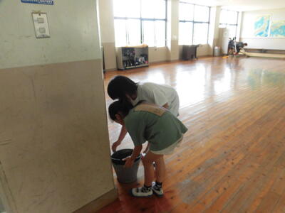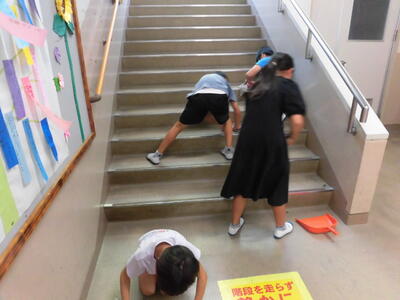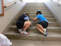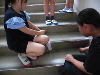昇降口にいると、3年生の「かなへび少女隊」が虫かごを持って降りてきました。