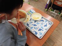 心配で1年生教室をのぞいたら、みんなお箸で食べていました。