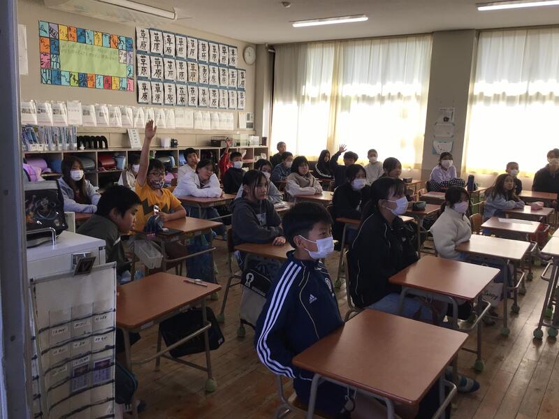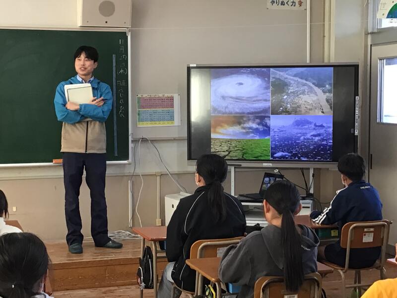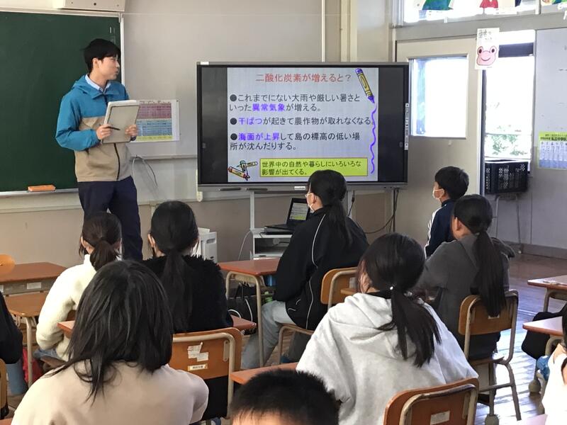 5年生教室で、玉名地域振興局林務課による「森林の働き」出前講座を開きました。児童たちは森林が果たす役割について、小堀先生の説明を聞きながら理解を深めました。講座では、森林が水を蓄え、空気を浄化し、動植物のすみかとなることなど、私たちの生活に欠かせない働きを持っていることが紹介され、子どもたちは自然の大切さを実感していました。また、地球温暖化防止や災害から地域を守る役割についても学び、環境保全の意識を高める機会となりました。