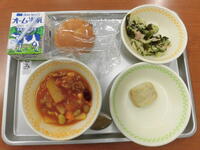 6月最後の給食のメニューは、「チーズパン ポークビーンズ あじナゲット 海藻サラダ」です。