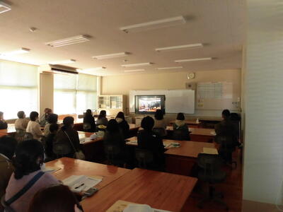 給食センターの徳永先生に、給食の作り方や栄養のバランスのことなどについて、分かりやすく教えていただきました。