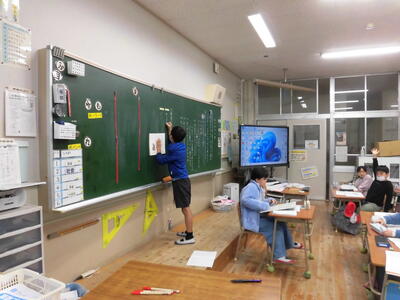 ICT支援員の方を講師にお迎えし、高学年の子どもたちにSNSの危険な面について学ぶ授業をしました。