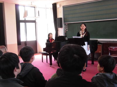 「オーシャンゼリゼ」や「カルメン」など、子どもたちにも親しみのある、またはこれから必ず出会うであろう曲を選んでいただき、実演だけでなく歌唱指導までしていただきました。