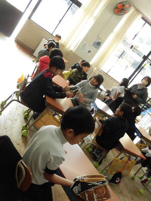 大谷選手からいただいたグローブは、1年生から順にさわったり手にはめてみたりしています。