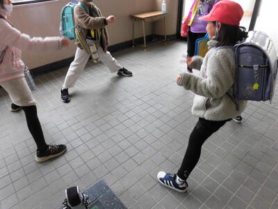女の子たちが、じゃんけんで負けたらタイル1枚分だけ足を広げていくゲームをやっていました。