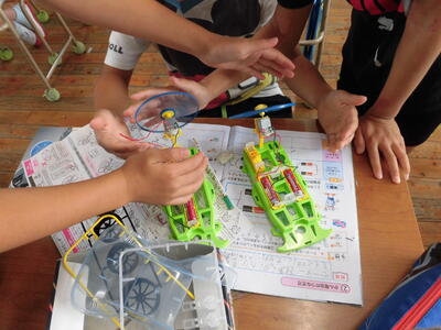 4年生は、電池をつないで風車を早く回すには、どうすればいいか、調べていました。