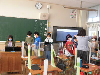 4年生は、見学旅行のまとめ発表のリハーサルをしていました。