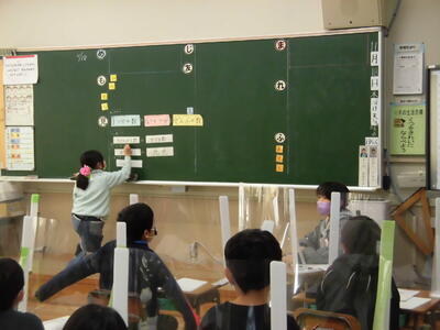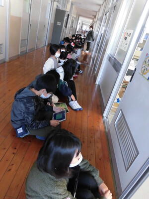 昼休みのホールでは、4年生が発表の準備をしていました。
