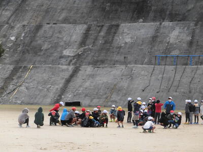 運動場で遊んでいる子は、運動場の中央へ避難。