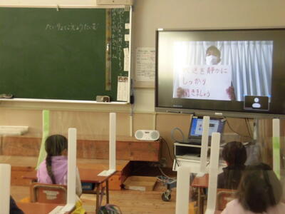 体育委員会、放送委員会、環境委員会の子供たちが、オンラインで全校児童に呼びかけました。