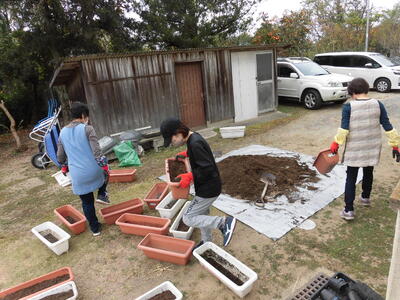 今日は、事務の戸上先生と用務員の西田さん、スクールサポートスタッフの松永さんに、土の準備をしていただきました。