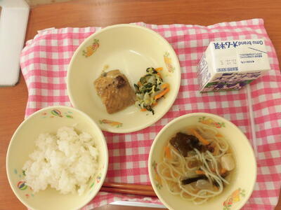 今日の給食は、「ごはん」「魚そうめん汁」「さばゆずみそ煮」「ごまあえ」に牛乳です。