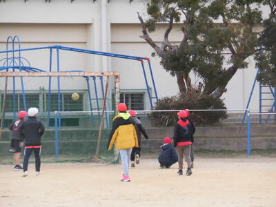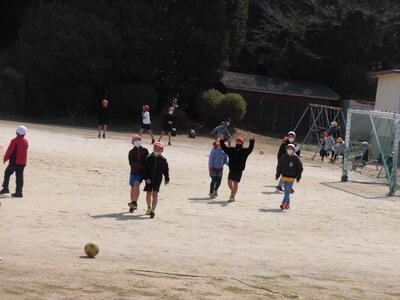 黄色い帽子の1年生に、6年生がサッカーを教えてくれています。