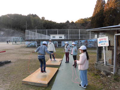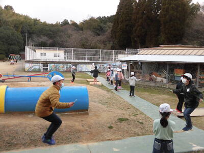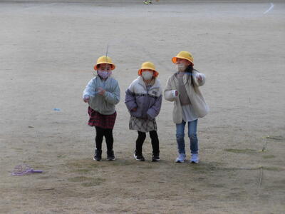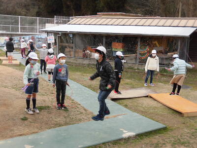 1年生のなかよし3人組が、トリオ縄跳びに挑戦していました。