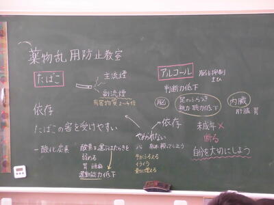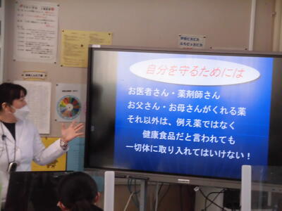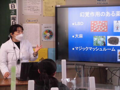 学校薬剤師の高田良子先生をお迎えして、「薬物乱用防止教室」を行いました。