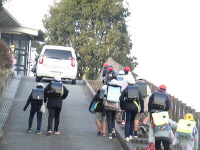 登校班が解けてところで、駆け出したり、二人組になったり、坂の上でお友達を待ったりする姿があります。
