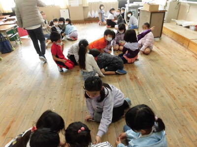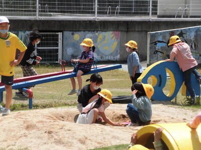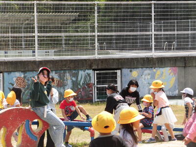 優しい6年生のお兄さんお姉さんたちが、毎日、黄色い帽子の1年生と遊んでくれています。
