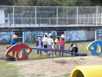 雨で湿っていたので少し使いづらかったのですが、早速1年生は運動場に出ていました。