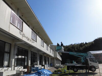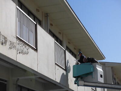 昨日から、低学年教室のベランダ上部にあたる壁面の修繕をしました。