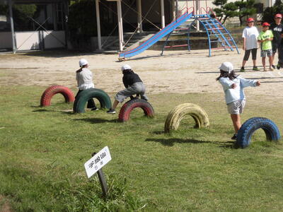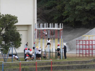工事がすっかり済んだ三段ガケが見守る中、体操に棒登りにと、はりきっています。