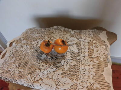 先日まで、ミニスイカを飾っていたところに、今日いただいた「柿」を置いてみました。