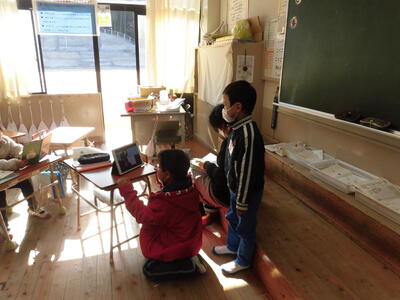 子供たちの手にはタブレットが握られています。