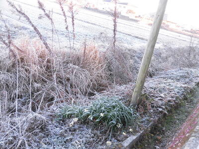 あぜ道のスイセンも霜に覆われ寒そうです。