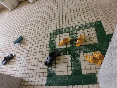 恥ずかしい話ですが、低学年男子のトイレのスリッパが並びません。