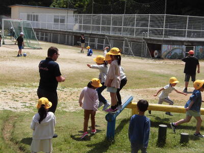 ALTのアラン先生が、昼休みに子供たちに誘われて、運動場に!