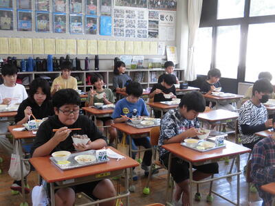 世界遺産登録8周年記念ということで、「石炭ざくざく豆ごはん」が給食のメニューです。