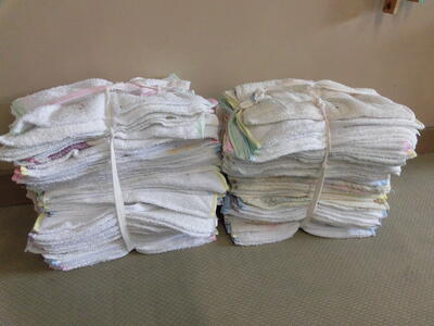 たくさんの雑巾と、ペットボトルキャップ、リングプルなどです。