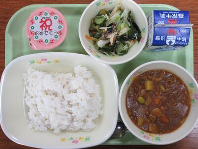 ポークカツカレーライス、海藻サラダ、お祝いゼリー、牛乳