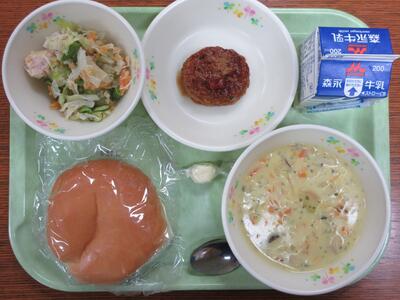 ハンバーグのケチャップソース、コーンスープ、春野菜のサラダ、チーズ、丸パン、牛乳