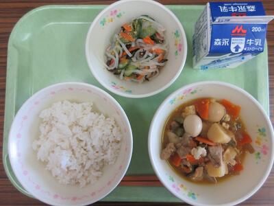 五目肉じゃが、マロニーの酢の物、麦ご飯、牛乳