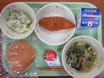 新ジャガのうま煮、切り干し大根のマヨネーズ和え、ミニトマト、わかめご飯、牛乳