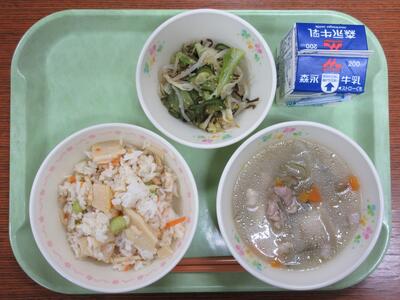 タケノコご飯、団子汁、塩昆布の即席漬け、牛乳