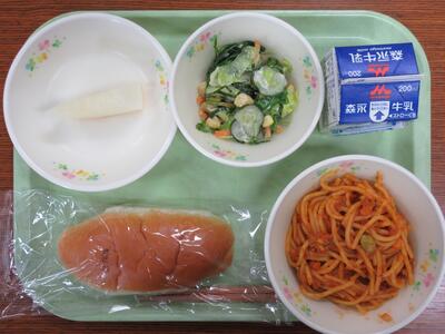 「シーザーサラダ」には、マヨネーズ、すりおろしたニンニク、砂糖、コショウ、薄口醤油を混ぜたドレッシングがかかっています。今日は「スパゲティミートソース」や「メロン」など、給食で人気があるメニューがそろいました。