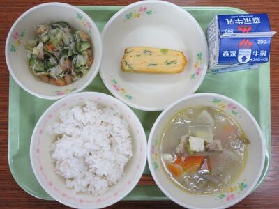 益城産小松菜の卵焼き、炒り大豆のかみかみサラダ、豚汁、麦ご飯、牛乳