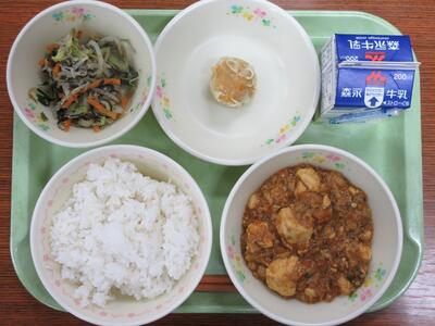 麻婆豆腐、ニラの海苔じゃこ和え、にんじん焼売、麦ご飯、牛乳
