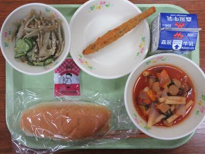ミネストローネ、ししゃもフライ、ごぼうナッツサラダ、マーシャルビーンズ、コッペパン、牛乳