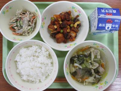 白身魚とレバーのチリソース、春雨スープ、ごぼうサラダ、麦ご飯、牛乳