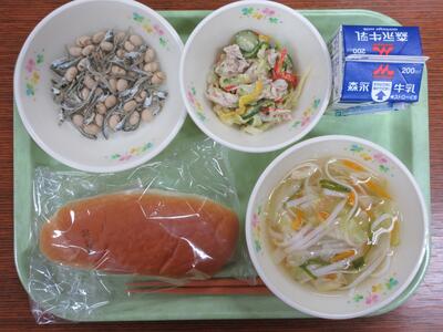 冷しゃぶサラダ、汁ビーフン、いりこ大豆、ミルクパン、牛乳