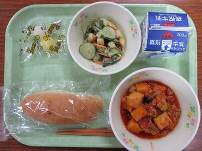 厚揚げミートソース煮、シーザーサラダ、お月見団子、コッペパン、牛乳