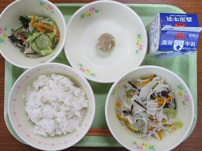 カボチャの味噌汁、イワシの生姜煮、春雨の酢の物、麦ご飯、牛乳