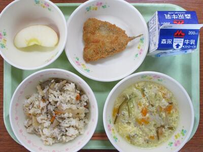 大根飯、あじフライ、かき玉汁、りんご、牛乳