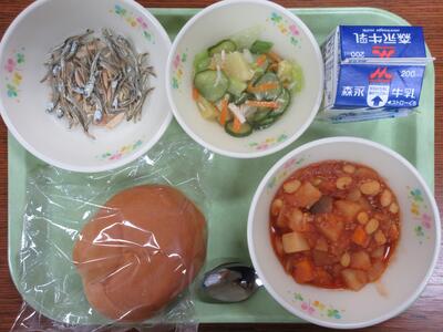 大豆とひき肉のトマト煮、フレンチサラダ、いりことアーモンド、コッペパン、牛乳