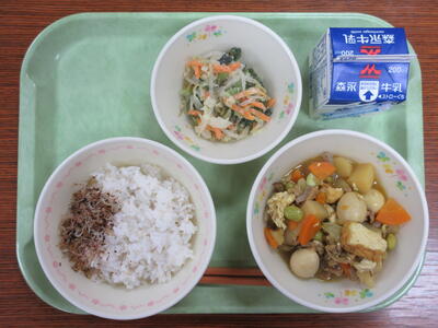 今日も朝から蒸し暑い天気となりました。暑い日には食欲も低下するので、給食のメニューでは、いろいろな工夫がされています。今日はカレー味の肉じゃがや手作りのふりかけがありました。